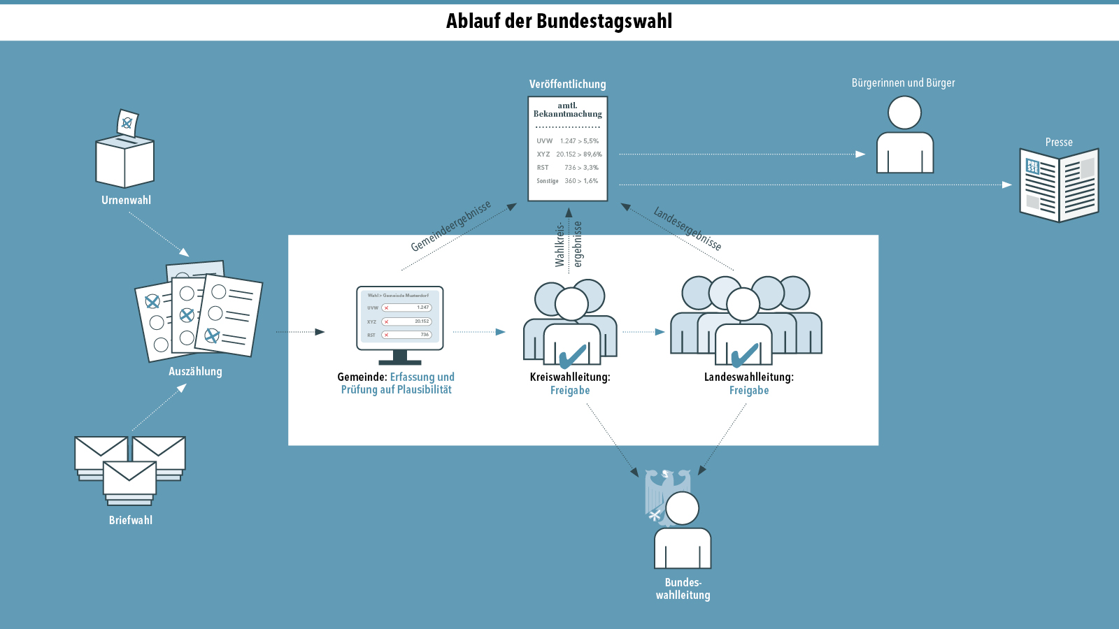 Am Wahlabend werden die Wahlergebnisse durch die Gemeinden erfasst und auf Plausibilität geprüft. Kreiswahl- und Landeswahlleitung überwachen die Erfassung und geben die Ergebnisse frei. Die Landswahlleitung leitet die Kreiswahlergebnisse an das Wahlabwicklungssystem (WAS) des Bundes weiter.
